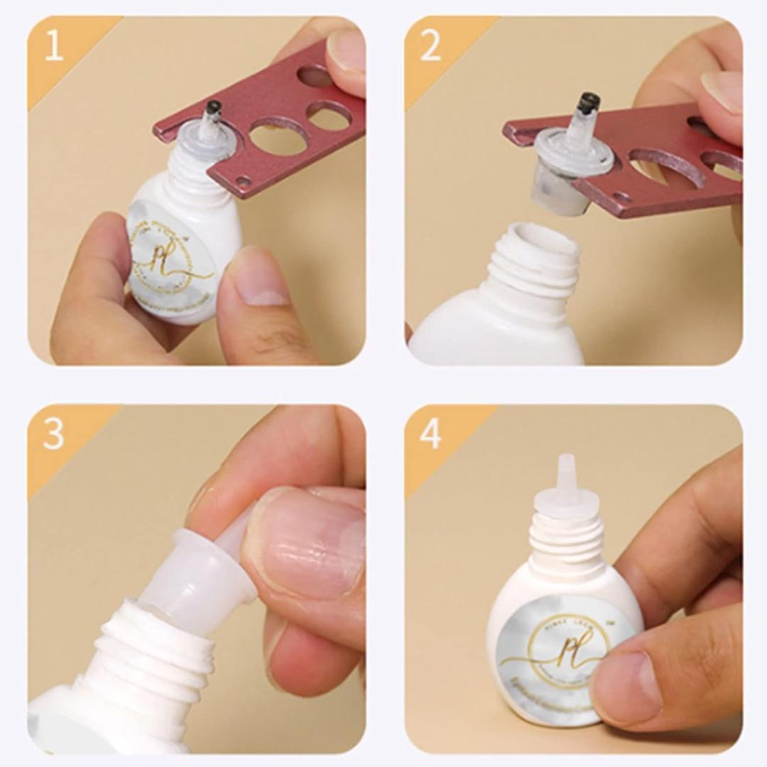 〈使用方法〉中蓋とボトルの間にオープナーを差し込みます。ボトルをしっかり持ち、ドロッパーオープナーの持ち手部分を押し下げ、ドロッパーを浮かせます。